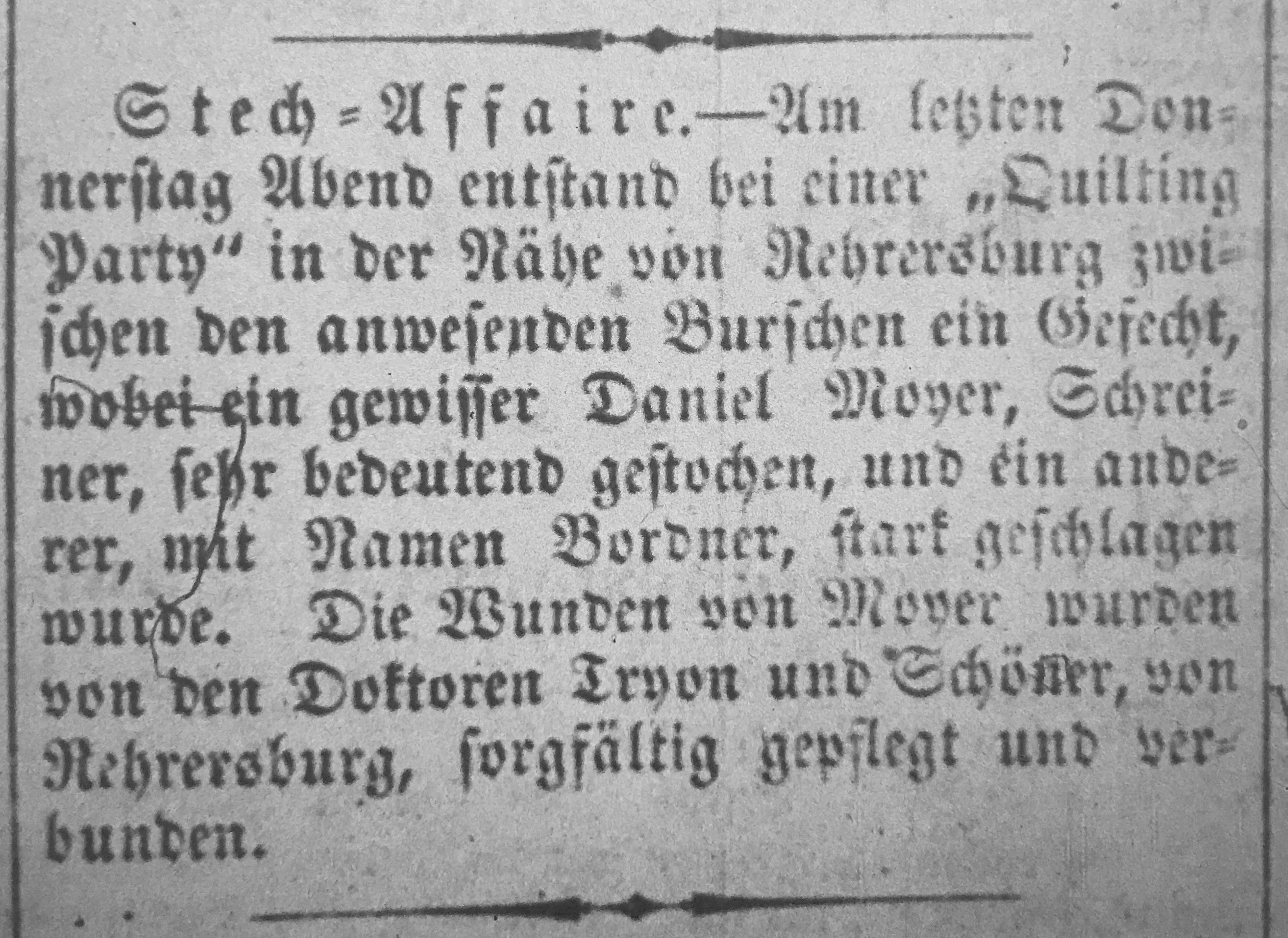 The news item recounts a fight that broke out at a quilting party near Rehrersburg, Berks County. It involved some of the men in attendance. Daniel Moyer, a carpenter, was stabbed and another man was punched. Moyer’s wounds were severe enough to require care and dressing by some local doctors.
