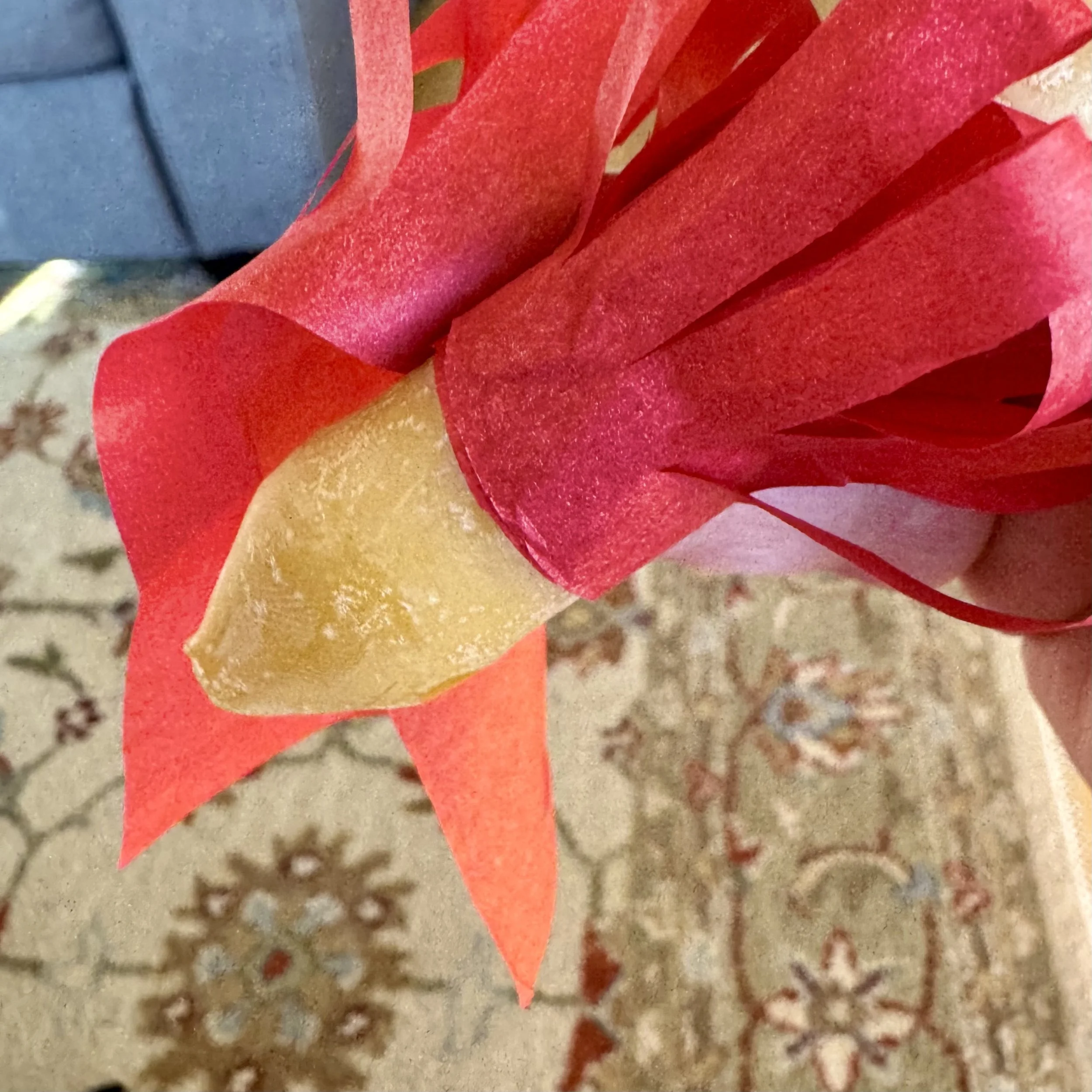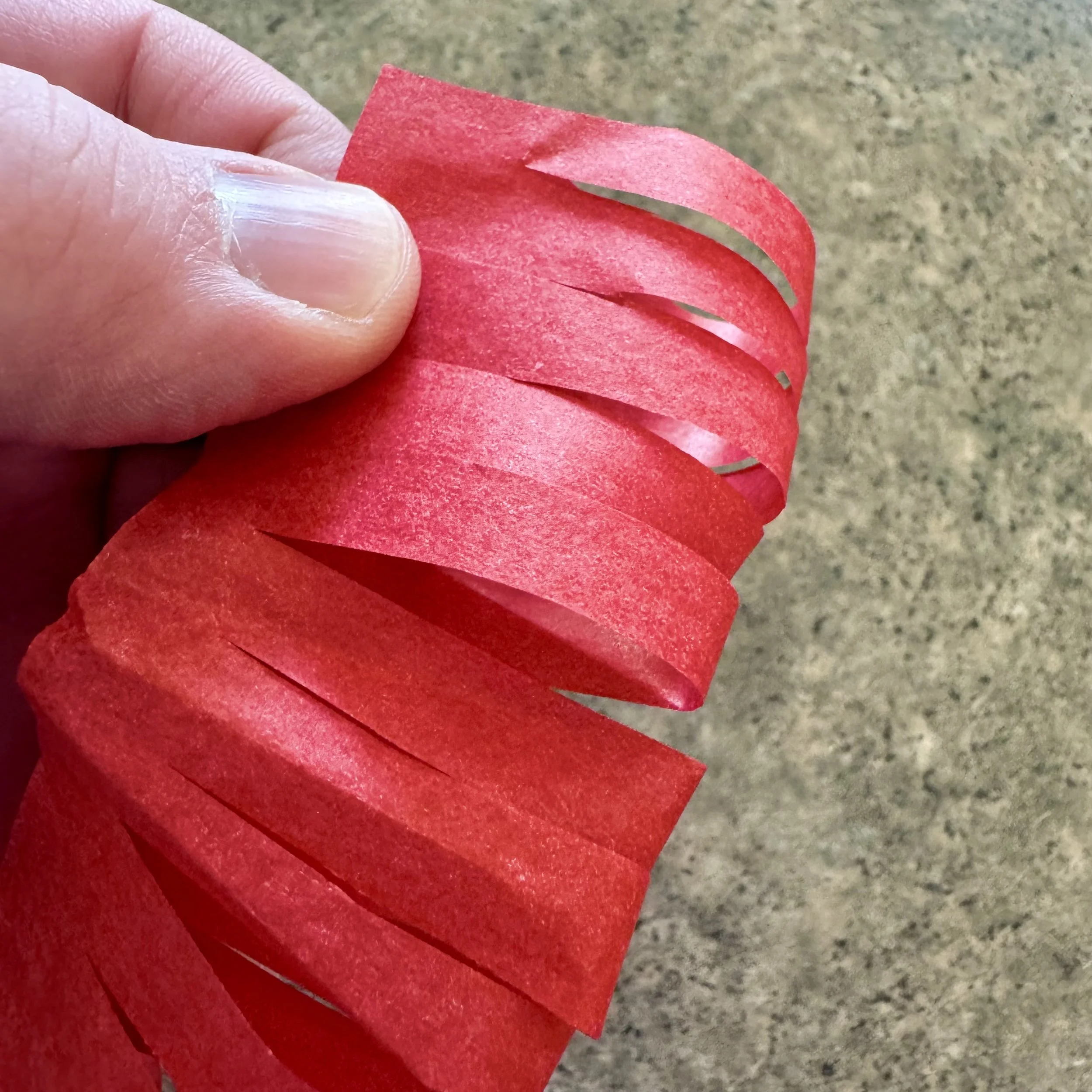 Cut out a piece of red tissue paper about 8.5 inches by 3.5 inches. Gently fold (don’t crease) lengthwise and cut into the fold every 1/4 inch. Make sure not to cut all the way down to the paper edge.