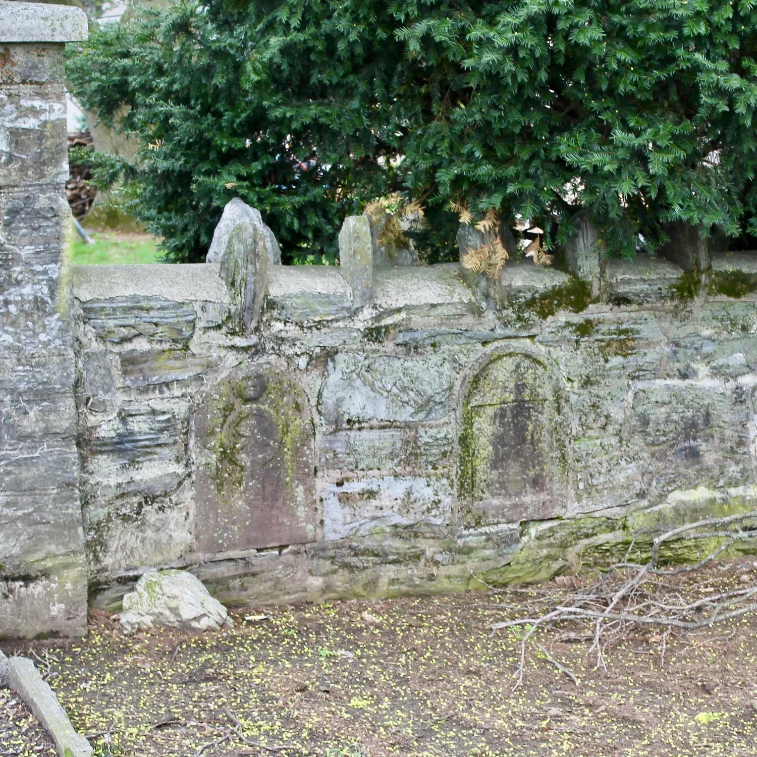 When I was last there, the stones were covered in moss and lichens, but they’ve since been cleaned — one with a heart and the date 1761 followed by the names of the builders; the other with a round (moon?) face and six-pointed star.