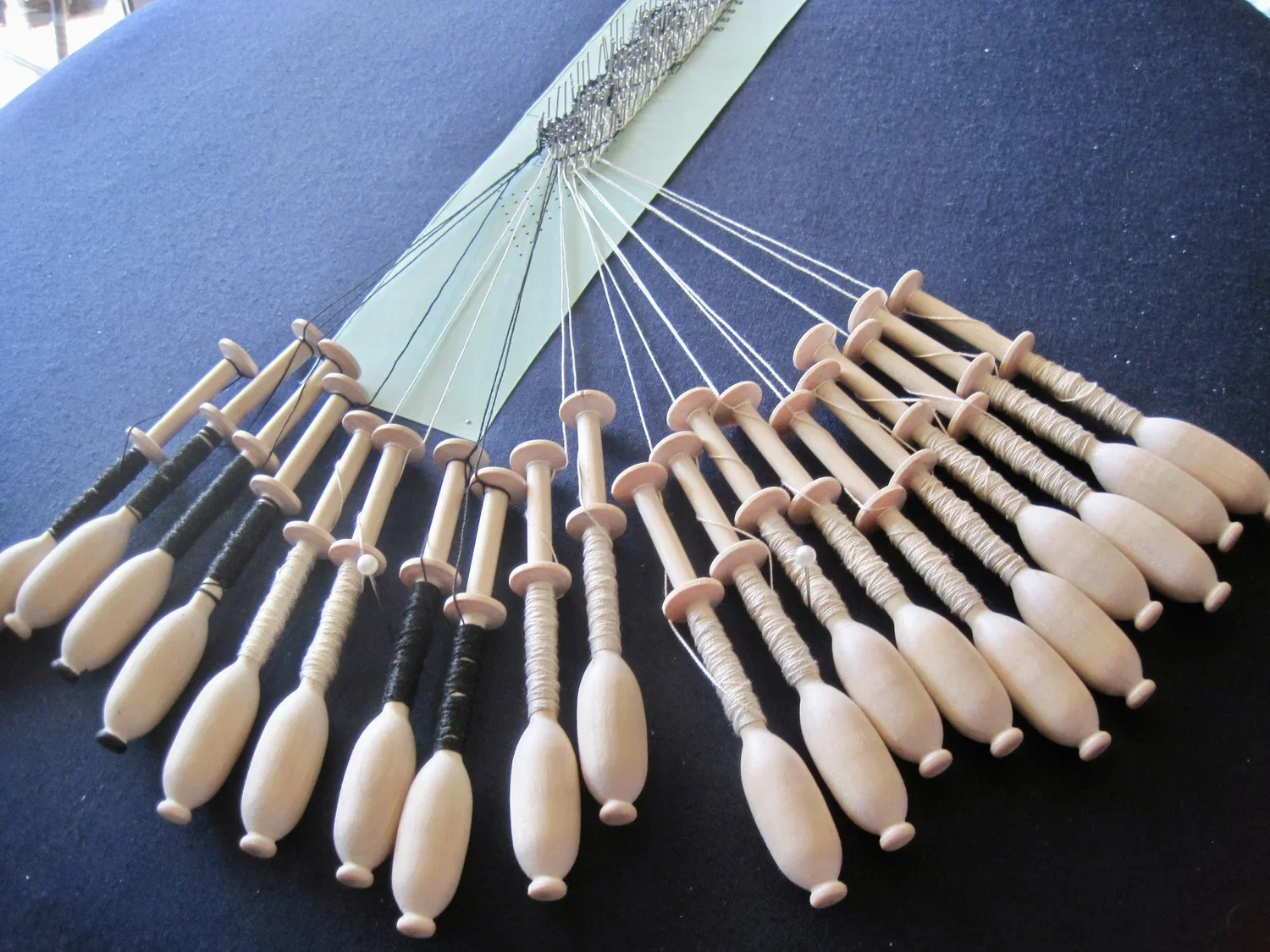 Making lace can be extremely time-consuming. The most “sophisticated” way is through traditional needle lace. With a grounding thread, you create a design and then create a web of thread in the open spaces with a variety of decorative open stitches. Another way is through bobbin lace, where pairs of bobbins wound with thread are twisted and knotted in pattern to create lace. Both ways basically create open, lacey fabric just out of thread.