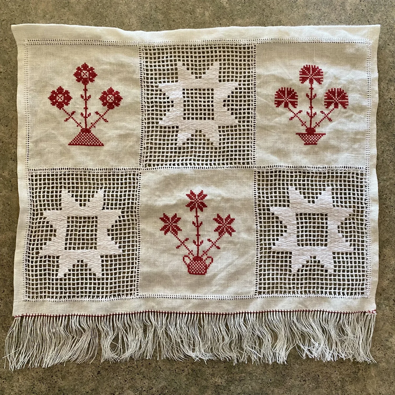 The Pennsylvania Dutch enjoyed yards of handwoven linen in the homespun era and sometimes they used drawn thread to further decorate their embroidered items. Mostly commonly drawn thread was used in a panel of the ausgeneht handduch ‘decorated towel.’ These decorated towels used to hang on the parlor side of a door to the kitchen in older Pennsylvania Dutch homes. It is fairly time consuming and a bit nerve-wracking to cut away threads of fabric and remove them.