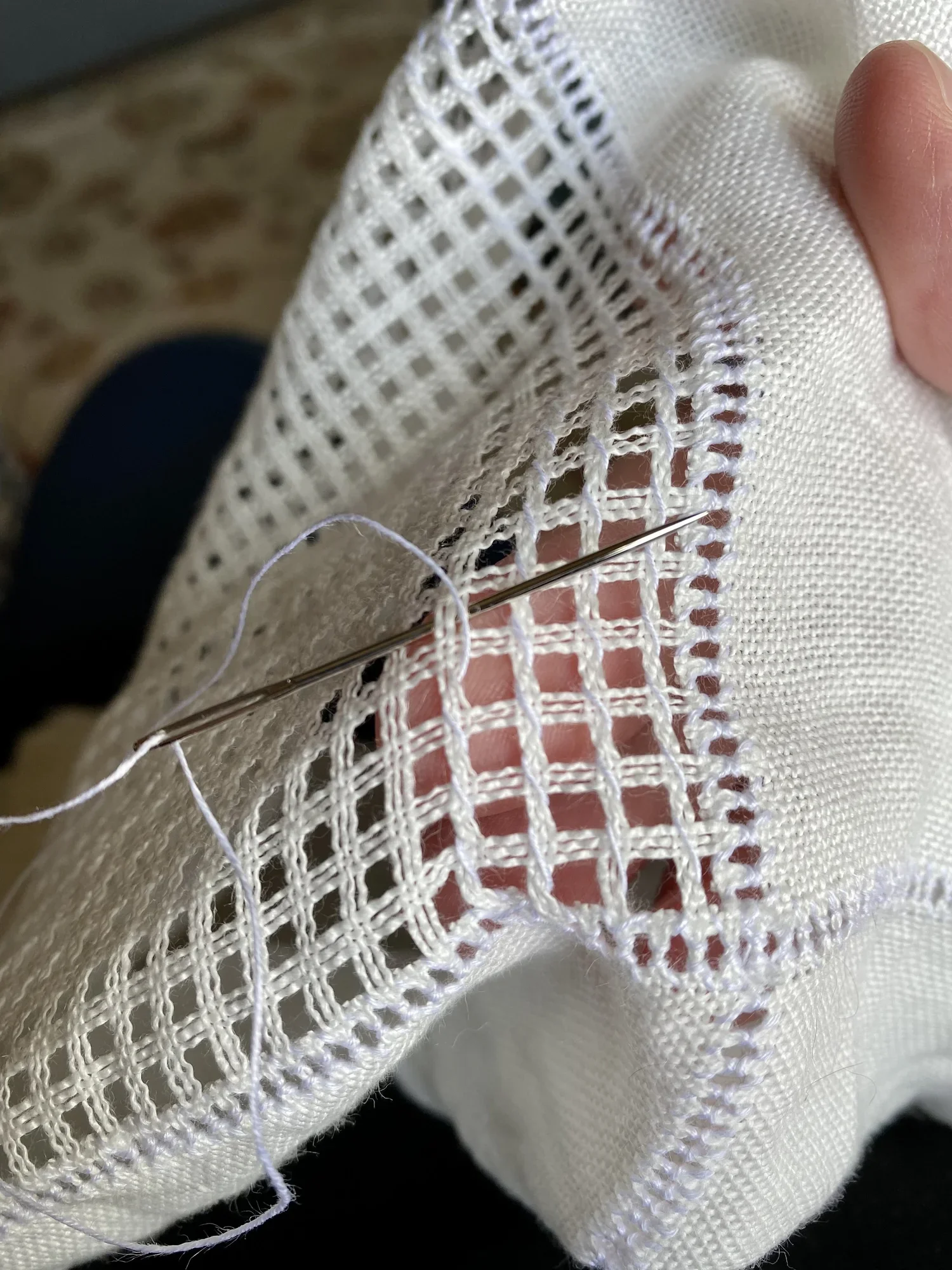 But you can create lace by simply making holes in already woven fabric. An early form of this so-called cutwork is reticella that was popular through the 17th century. Related to cutwork is drawn thread work where threads from either the warp (vertical threads) or weft (horizontal threads) of the fabric are drawn out to create holes, achieving a lace look.